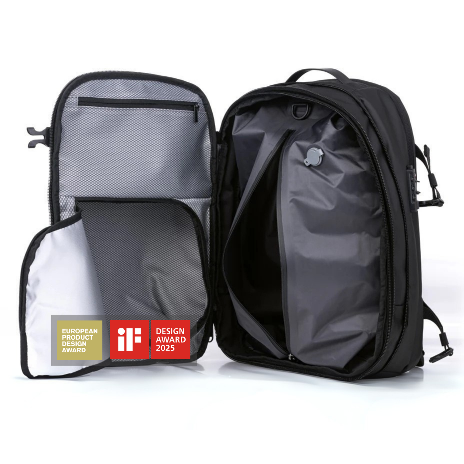 Built-in vacuum system that enables you to maximize your packing space by reducing the volume of your clothes and other packable items. No need to worry about overpacking or squeezing in that extra jacket anymore!